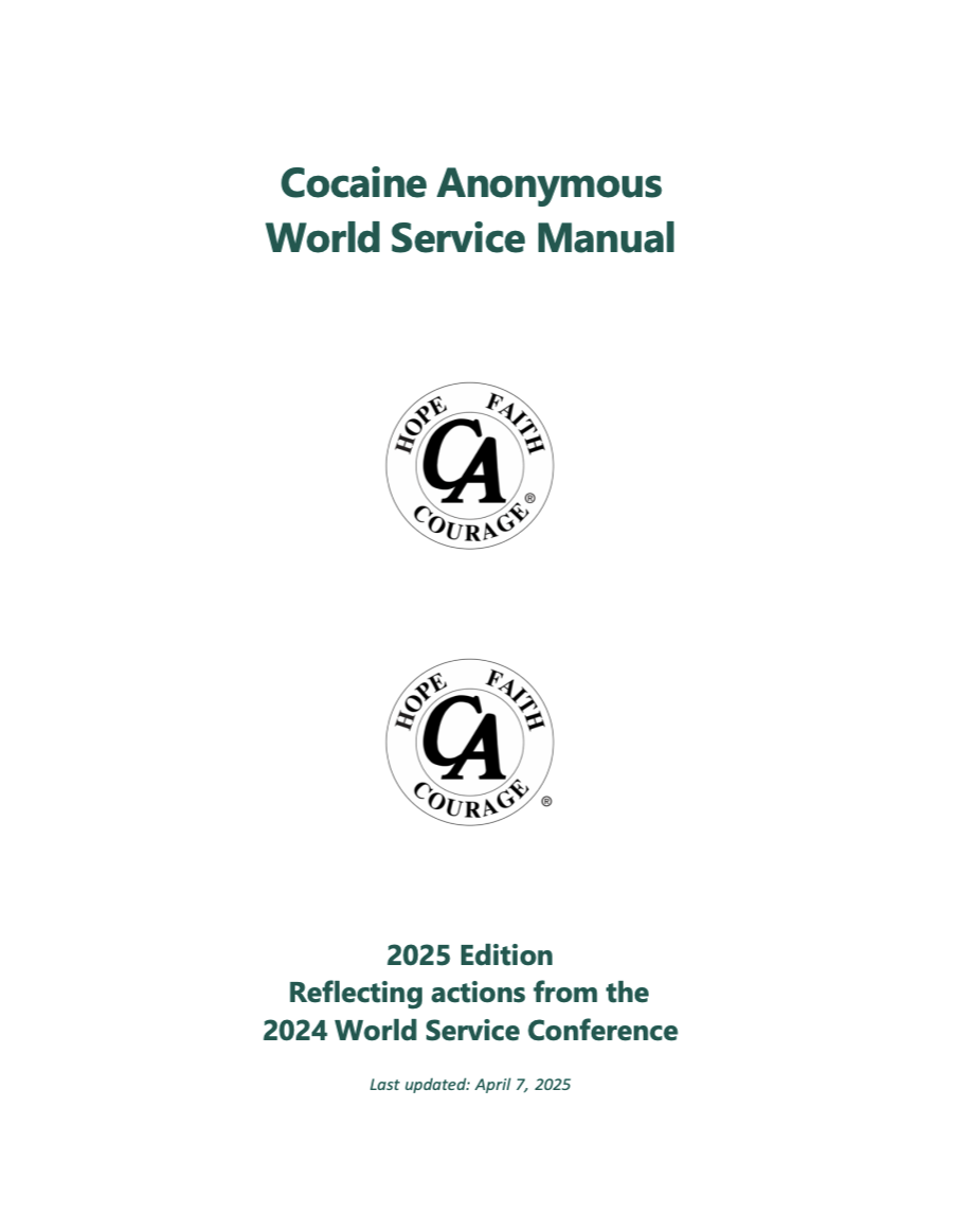 World Service Manual 2025 Download ⤓ Report an error or send an update? Email pi@ca-sweden.se. Featured Logo, Swedish, PNG CA Sweden logo green png format for web Logo, Swedish, PNG ⤓ Logo, Swedish, PNG Manual, English, PDF World Service Manual 2025 Manual, English, PDF ⤓ Manual, English, PDF Manual, English, PDF World Service Manual 2023 Manual, English, PDF ⤓ Manual, English, PDF Roll Up, CA 12 steps, PDF The 12 Steps Roll Up 60x200 cm for print pdf format Roll Up, CA 12 steps, PDF ⤓ Roll Up, CA 12 steps, PDF Roll Up, CA 12 traditions, PDF The 12 Traditions Roll Up 60x200 cm for print pdf format Roll Up, CA 12 traditions, PDF ⤓ Roll Up, CA 12 traditions, PDF Roll Up, CA 12 steps, PDF, English The 12 Steps Roll Up 60x200 cm for print pdf format Roll Up, CA 12 steps, PDF, English ⤓ Roll Up, CA 12 steps, PDF, English Roll Up, CA 12 traditions, PDF The 12 Traditions Roll Up 60x200 cm for print pdf format Roll Up, CA 12 traditions, PDF ⤓ Roll Up, CA 12 traditions, PDF CA 12 concepts, English, PDF CA's 12 English concepts CA 12 concepts, English, PDF ⤓ CA 12 concepts, English, PDF ca-sweden.se, QR code, PNG QR code ca-sweden.se black png format ca-sweden.se, QR code, PNG ⤓ ca-sweden.se, QR code, PNG ca-sweden.se, QR code, PNG QR code ca-sweden.se vit png format ca-sweden.se, QR code, PNG ⤓ ca-sweden.se, QR code, PNG Poster,PDF, CA 12 steps A3 poster for printers CA's 12 steps Poster,PDF, CA 12 steps ⤓ Poster,PDF, CA 12 steps Poster,PDF, CA 12 traditions A3 poster for printers CA's 12 Traditions Poster,PDF, CA 12 traditions ⤓ Poster,PDF, CA 12 traditions Collection, Starter Kit, PDF, ZIP File Starter kit for new CA meeting Collection, Starter Kit, PDF, ZIP File ⤓ Collection, Starter Kit, PDF, ZIP File Collection, Meeting document, PDF, ZIP File All readings Collection, Meeting document, PDF, ZIP File ⤓ Collection, Meeting document, PDF, ZIP File Manual, meeting document, docx Meeting manual docx format Manual, meeting document, docx ⤓ Manual, meeting document, docx Manual, Meeting document, PDF Meeting manual pdf format Manual, Meeting document, PDF ⤓ Manual, Meeting document, PDF Readings, PDF To the Newcomer Readings, PDF ⤓ Readings, PDF Readings, PDF Preamble Readings, PDF ⤓ Readings, PDF Readings, PDF Who is a C.A. member? Readings, PDF ⤓ Readings, PDF Readings, PDF We can recover Readings, PDF ⤓ Readings, PDF Readings, PDF Reaching out Readings, PDF ⤓ Readings, PDF 12 Steps 12 Traditions, PDF CA's 12 Steps and 12 Traditions 12 Steps 12 Traditions, PDF ⤓ 12 Steps 12 Traditions, PDF Agenda, PDF Agenda group service meeting Agenda, PDF ⤓ Agenda, PDF Sign, PDF CA meeting here A4 Sign, PDF ⤓ Sign, PDF Sign, PDF CA meeting here A4 Sign, PDF ⤓ Sign, PDF Manual, readings, English, PDF CA World Meeting Formats 2019 Manual, readings, English, PDF ⤓ Manual, readings, English, PDF Manual, PDF Inventory of traditions Manual, PDF ⤓ Manual, PDF Manual, Service position, PDF Group Service Representative (GSR) Manual, Service position, PDF ⤓ Manual, Service position, PDF Manual, Service position, PDF Group Treasurer Manual, Service position, PDF ⤓ Manual, Service position, PDF Logo, English, EPS CA World logo white/black eps for print Logo, English, EPS ⤓ Logo, English, EPS ManualsGuest UserSeptember 11, 2025Manual, English, PDF Facebook0